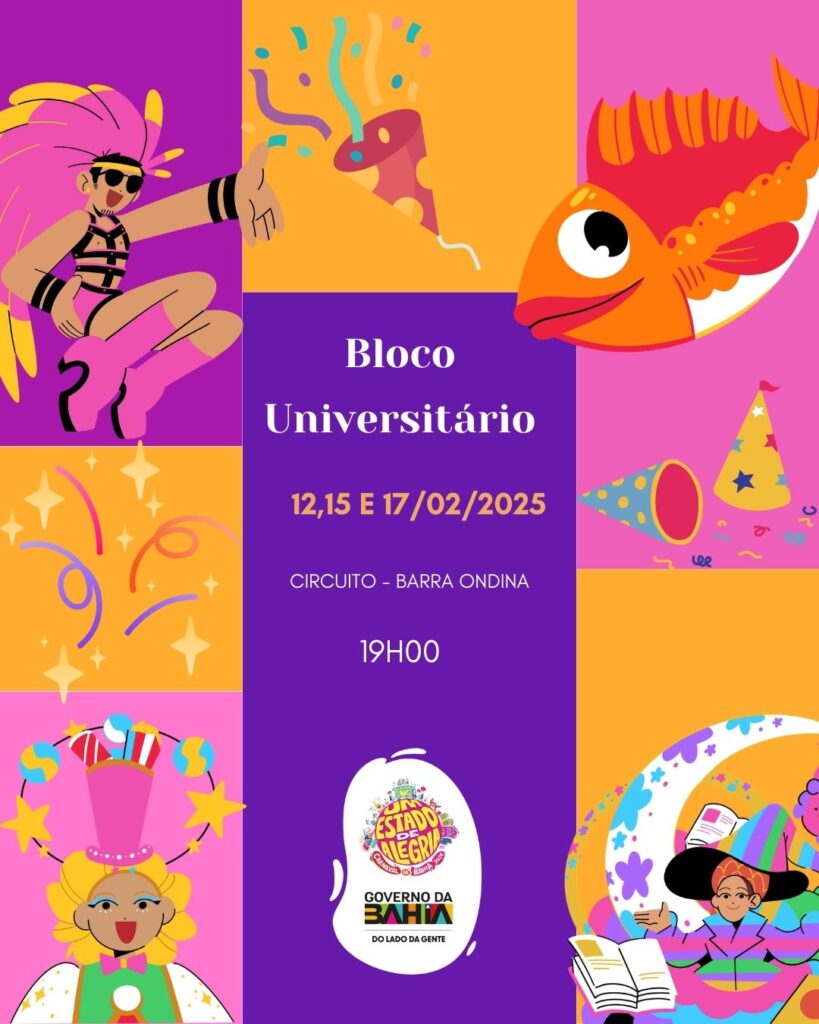 O Projeto “Bloco Universitário” será realizado no município de Salvador/BA, nos dias 12, 15 e 17 de fevereiro de 2026, integrando a programação oficial do Carnaval da Bahia 2026. A iniciativa promete levar muita música, animação e a energia característica da maior festa popular do estado para os circuitos carnavalescos da capital baiana.