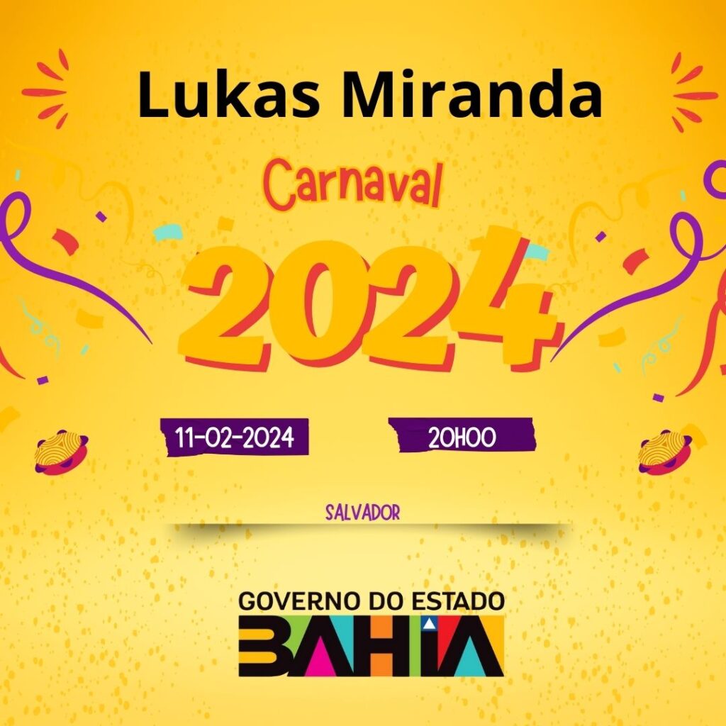 Lukas Miranda está confirmado para se apresentar no Carnaval da Bahia de 2024. A performance dele ocorrerá no Circuito Osmar, no Campo Grande, no dia 11 de fevereiro . Essa apresentação faz parte de uma programação repleta de artistas renomados que animarão a festa em diferentes circuitos de Salvador