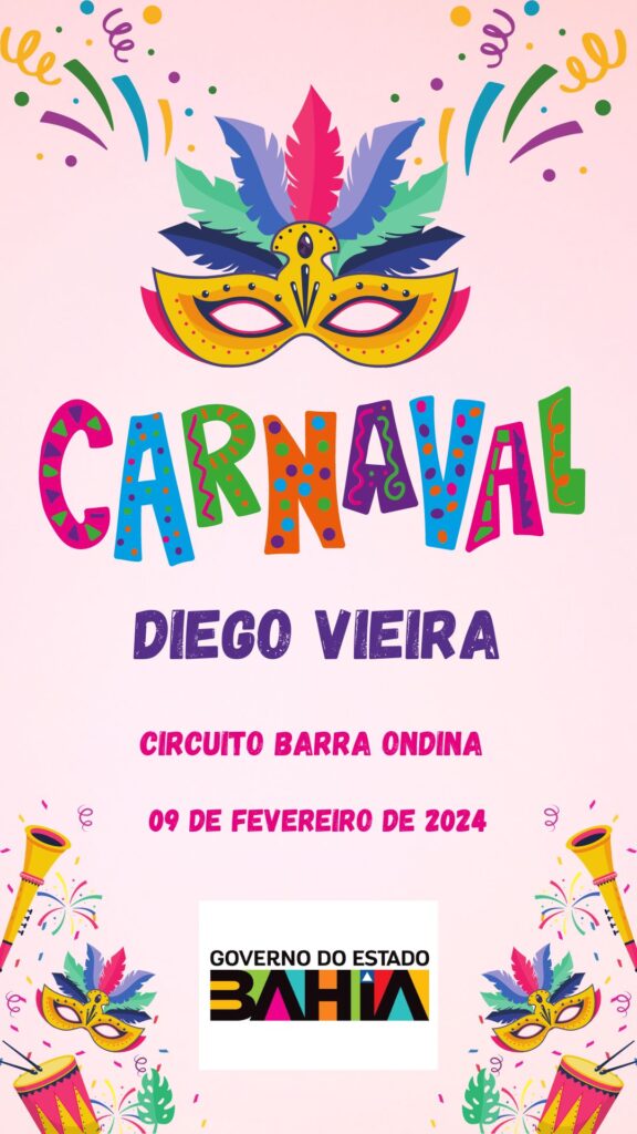 Diego Vieira vai se apresentar no dia 9 de fevereiro de 2024 no Carnaval de Salvador, no circuito Barra Ondina. Se precisar de mais informações sobre o evento ou sobre outros shows do Carnaval,
