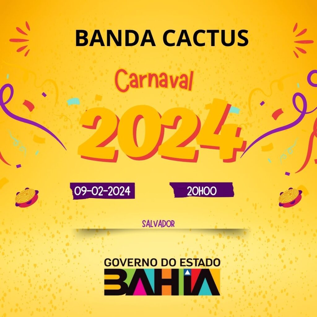 A Banda Cactus, uma das revelações da música baiana, promete realizar uma grande apresentação no próximo dia 09 de fevereiro dentro da programação do Carnaval da Bahia 2024. A banda trará um repertório variado e vibrante, puxando o Trio no circuito do Contra Fluxo, garantindo muita animação e alegria para os foliões. Com o apoio do Governo do Estado da Bahia, a apresentação da Banda Cactus será um dos destaques do Carnaval, refletindo a energia e a diversidade musical da Bahia.