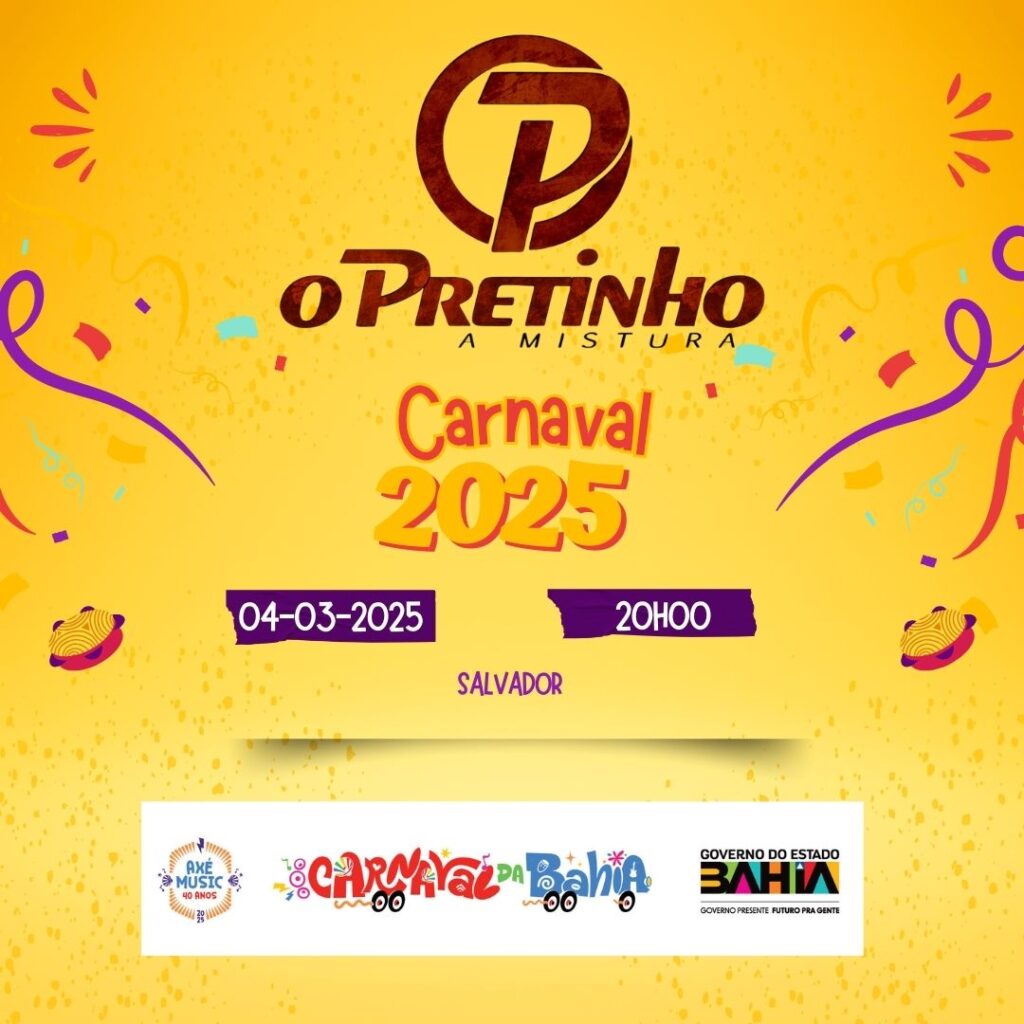 A Banda O Pretinho se apresenta no dia 04 de março de 2025, levando muito ritmo, alegria e identidade cultural para o público. Uma programação especial que conta com o apoio do Governo do Estado da Bahia, valorizando a música e a cultura popular. Prepare-se para viver esse grande momento!